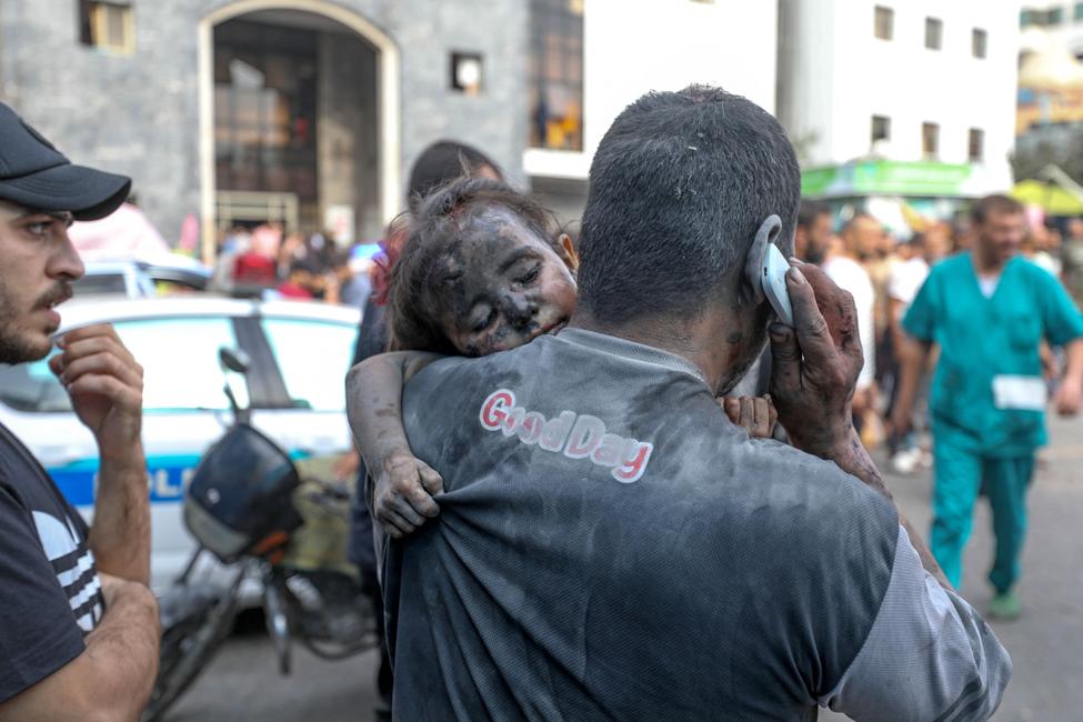 Un Palestinien porte une petite fille blessée à l'hôpital Al-Shifa de la ville de Gaza après des frappes israéliennes, le 29 octobre 2023.