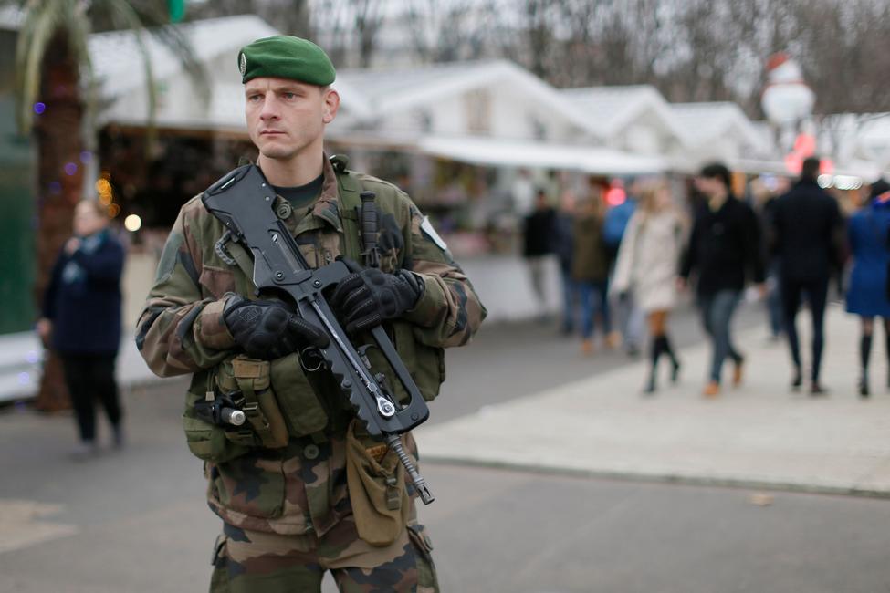Un militaire français patrouillant devant la tour Eiffel.