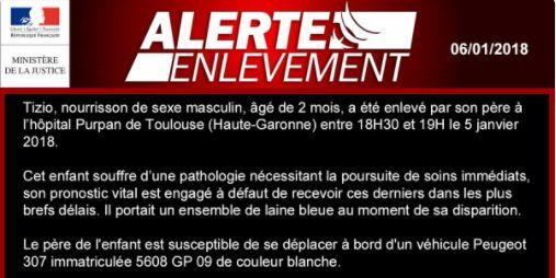 Le parquet de Toulouse a déclenché une alerte enlèvement ce samedi pour un nourrisson en danger de mort, enlevé vendredi par son père.