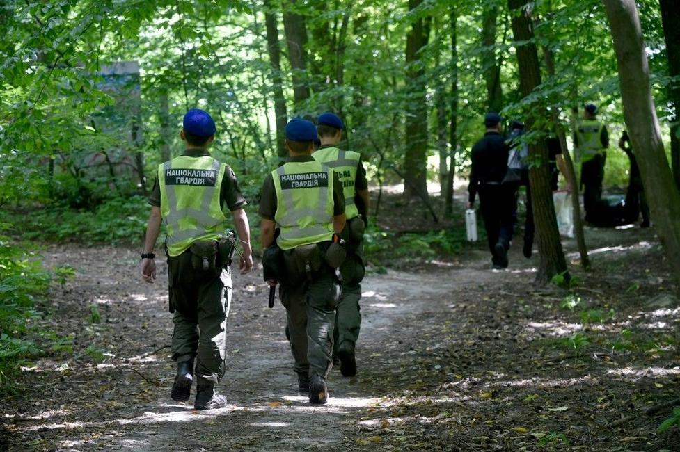 Des policiers quittent l'endroit où Vitali Chychov, le chef de la Maison biélorusse en Ukraine, une ONG, a été retrouvé pendu dans un parc, près de la capitale Kiev, le 3 août 2021.
