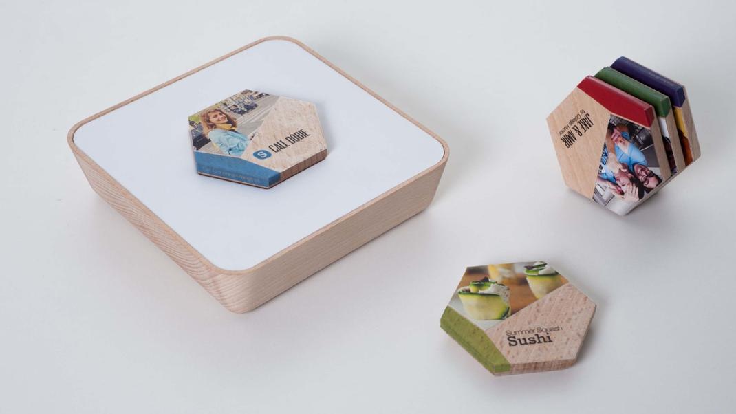 Qleek propose de rematérialiser vos playlists sur des galets hexagonaux à poser sur un lecteur en bois pour démarrer leur lecture. Pierre-Rudolf Gerlach, Johanna Hartzheim et Ismail Salhi surfe sur la tendance des objets connectés pour offrir un support physique design aux contenus audio, vidéo et fichiers digitaux allant de Youtube à Dropbox.